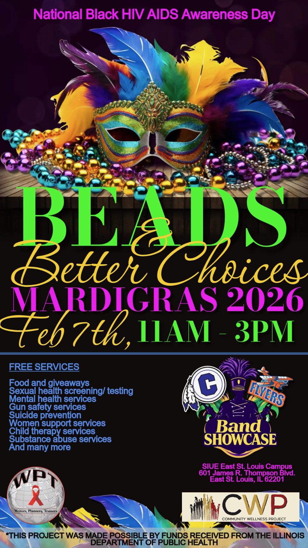Get ready for a Mardi Gras experience with purpose. Join us for BEADS & Better Choices, a free community event celebrating National Black HIV/AIDS Awareness Day with music, color, and resources that strengthen our community.